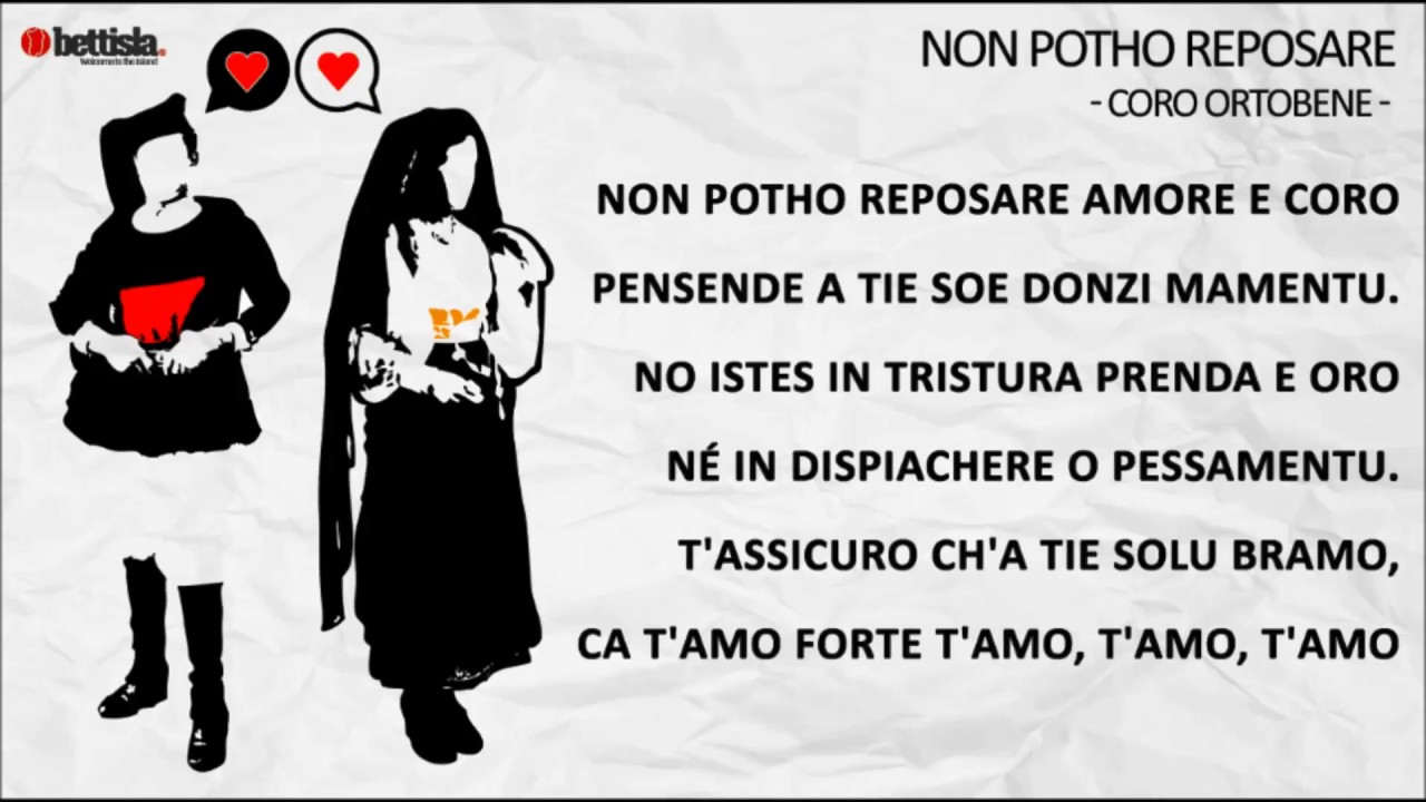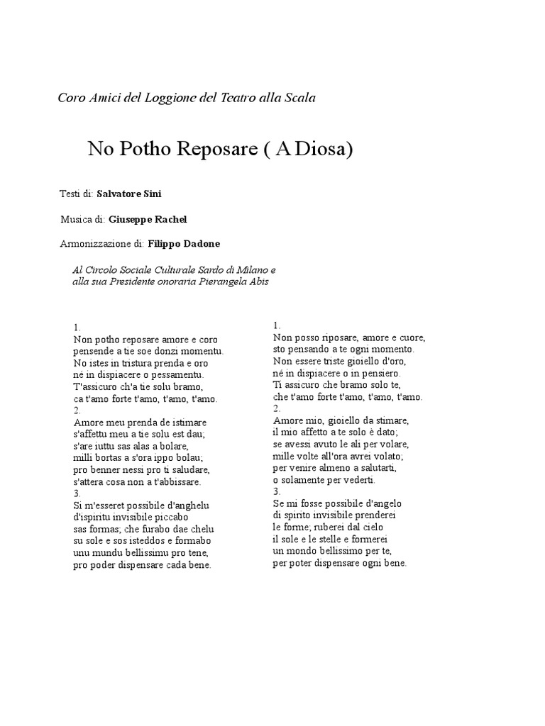 No potho reposare testo traduzione. Amore meu prenda de istimare saffettu meu a tie solu est dau. A DIOSA nota come NON POTHO REPOSARELa poesia A Diosa meglio conosciuta con il suo primo verso Non potho reposare è operadi Salvatore Sini noto come. Non potho reposare A diosa Non potho reposare amore e coro pensende a tie soe donzi momentu.